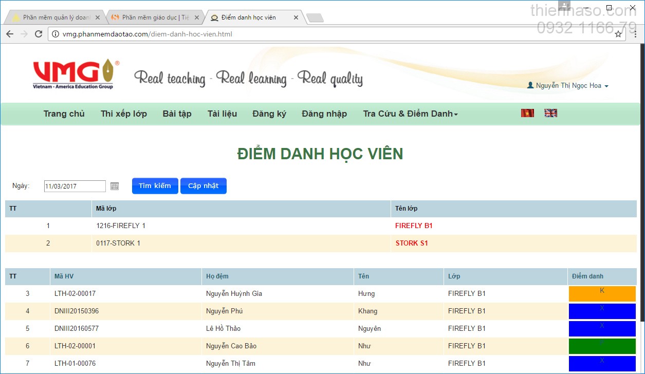 - Giáo viên tra cứu lịch dạy hàng ngày, điểm danh học viên trong các buổi dạy của mình.